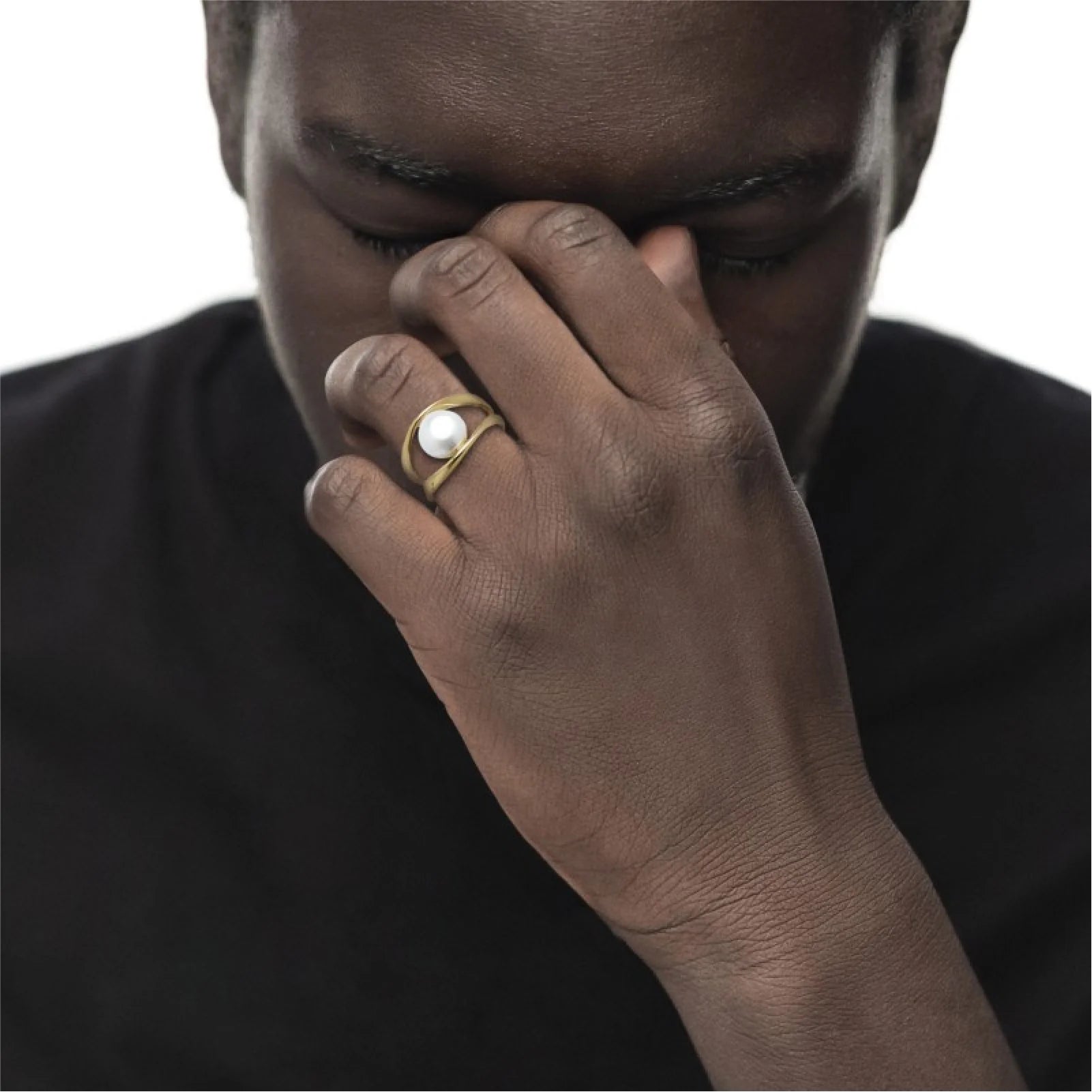 Anello della collezione Marlù Vision da donna. Colore: oro. Anello aperto in acciaio inossidabile 316L con trattamento pvd oro, a doppia fascia con incastonata al centro una perla a bottone bianca rivestita con diametro 0,8 cm.