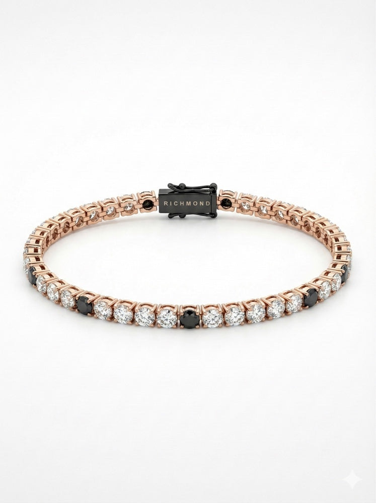 Rompi la monotonia con il bracciale "Rose Rhythm". Questo gioiello reinterpreta il classico tennis introducendo una sequenza visiva accattivante: cinque luminosi cristalli bianchi interrotti puntualmente da una pietra nera intensa, creando un motivo che cattura lo sguardo. La montatura con finitura in oro rosa (Rose Gold) aggiunge un tocco di calore e raffinatezza, mentre la chiusura tecnica nera a contrasto con logo John Richmond firma l'accessorio con un timbro di carattere deciso.