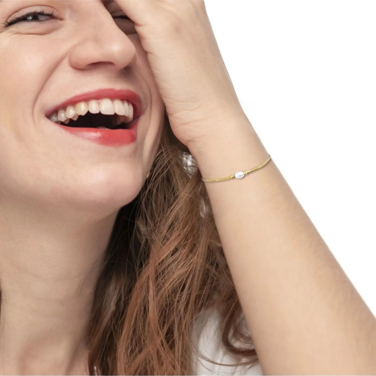 Bracciale catena della collezione Marlù Vision da donna. Colore: oro e bianco. Il gioiello è in acciaio inossidabile 316L con trattamento pvd oro con catena snake piatta con decoro, al centro una perla ovale bianca rivestita ed elementi. Chiusura a moschettone.