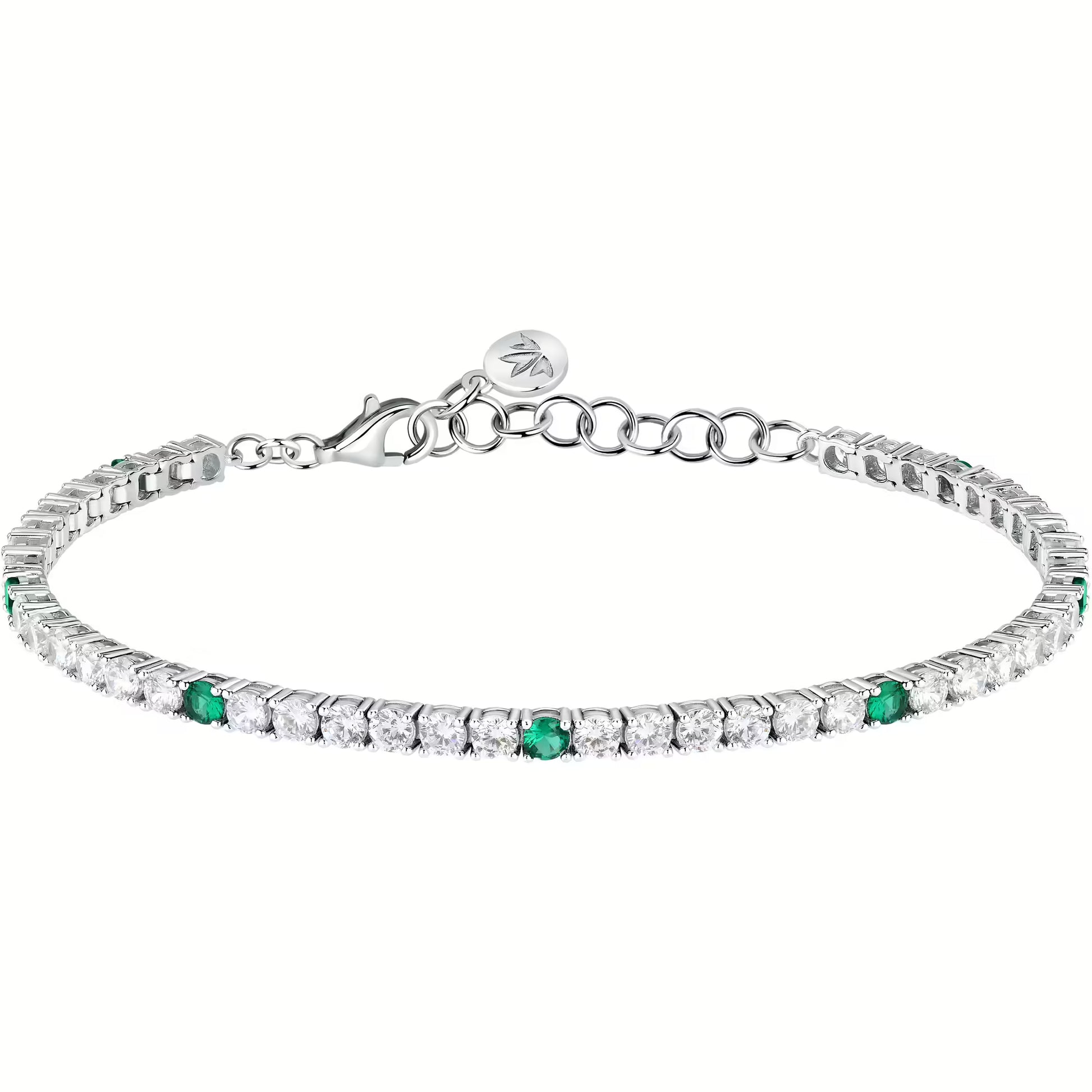 Bracciale da donna di Morellato della collezione Tesori. Bracciale tennis realizzato in argento 925 riciclato di colore bianco con pietre bianche e verdi. Lunghezza 16 cm + 3 cm e chiusura a moschettone. Peso circa 7,35 g. La referenza è SAIW138.