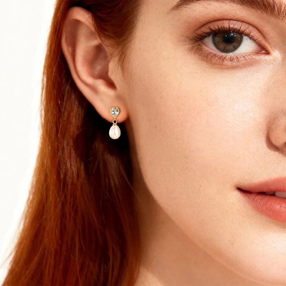 Orecchini pendenti in argento 925 dorato con zircone punto luce taglio cuore e perla a goccia di 7 mm. Lunghezza totale: 1,8 cm. Chiusura a farfallina.