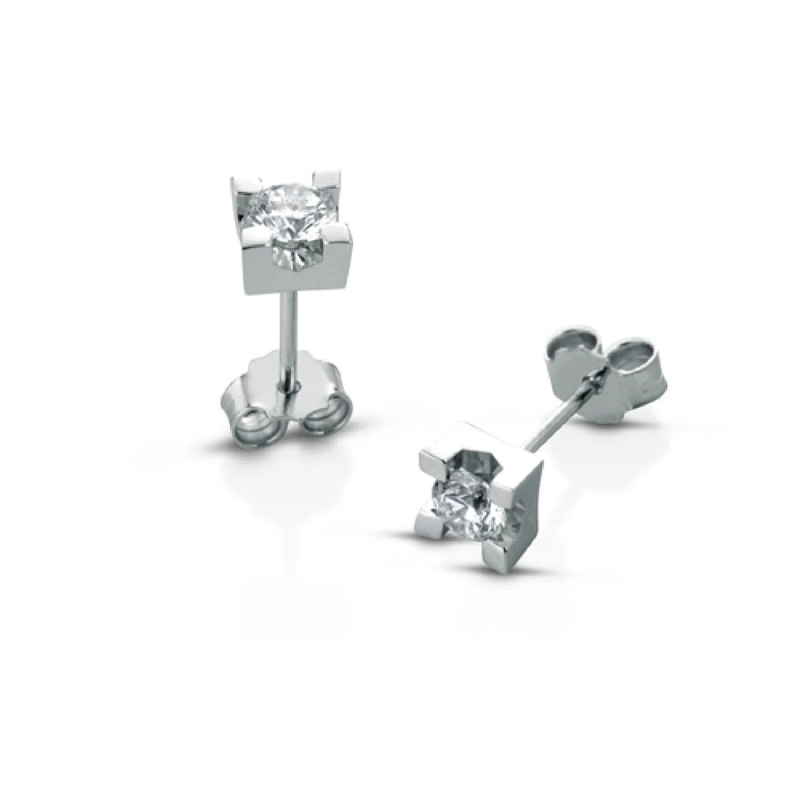 Orecchini punto luce in oro bianco 18 carati ideati e realizzati da Lucciole, gli orecchini sono impreziositi da due diamanti di carati totali 0,04 colore G purezza SI taglio brillante rotondo, peso 0,68 grammi, chiusura a farfallina.