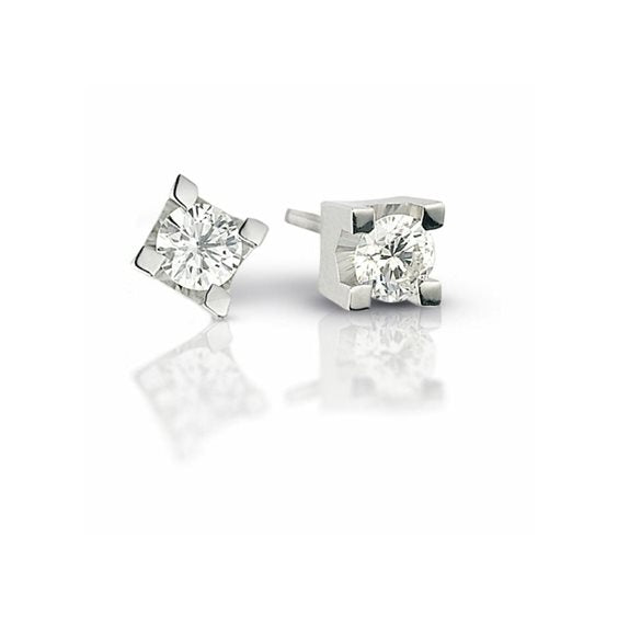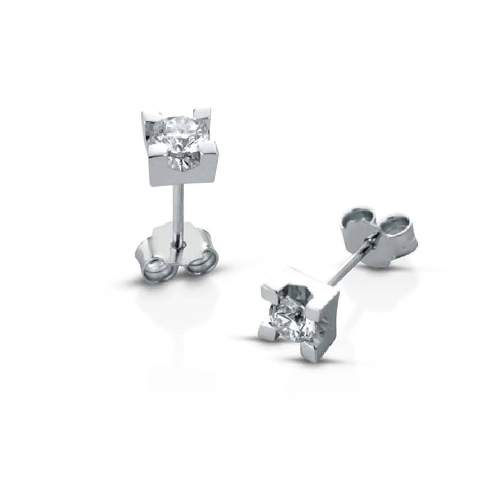 Orecchini punto luce in oro bianco 18 carati ideati e realizzati da Lucciole, gli orecchini sono impreziositi da due diamanti di carati totali 0,08 colore G purezza SI taglio brillante rotondo, peso 0,72 grammi, chiusura a farfallina.