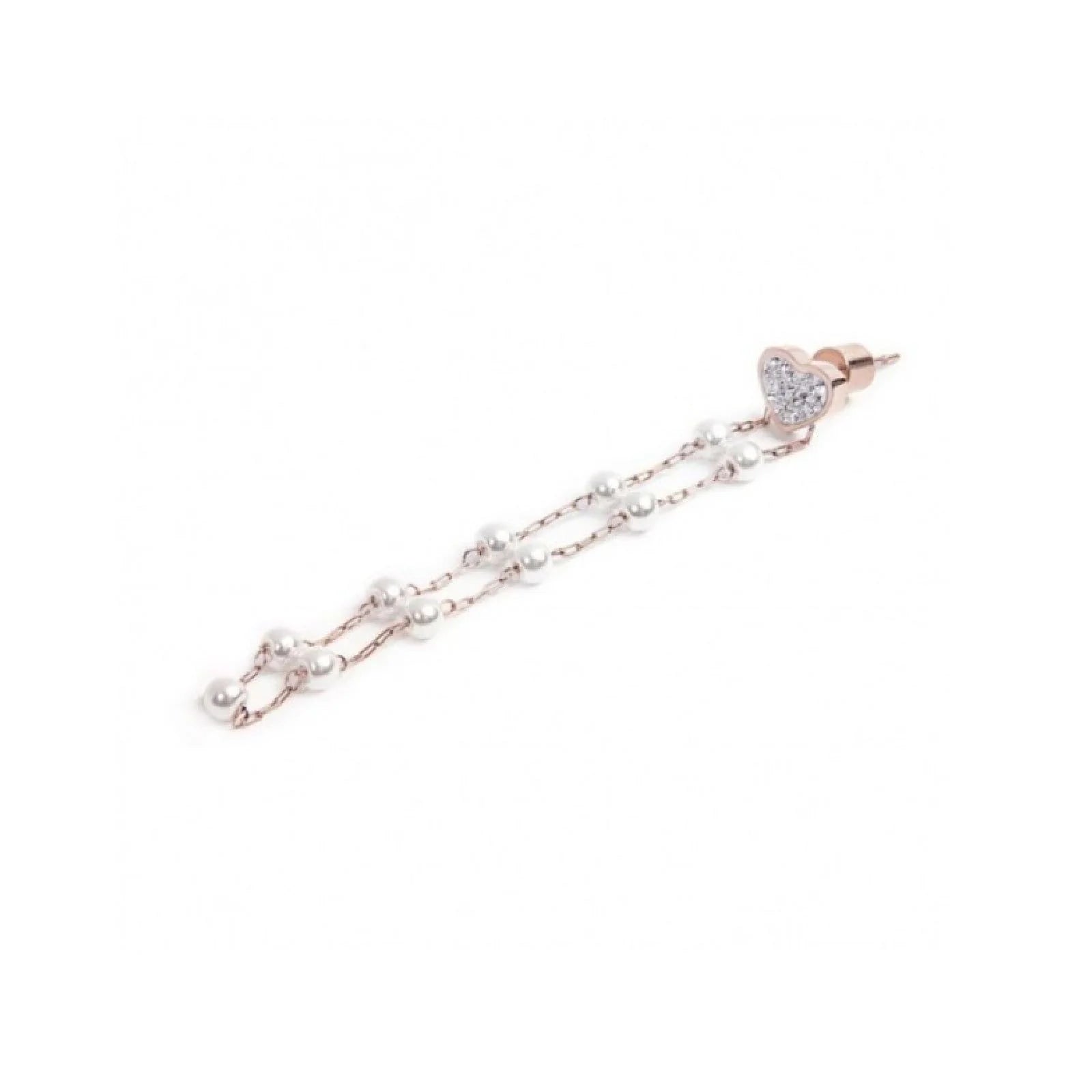 Orecchino singolo pendente della collezione Marlù Nel Mio Cuore da donna. Colore: pvd oro rosa. Orecchino in acciaio inossidabile 316L con trattamento in pvd oro rosa formato da un cuore in pavè di cristalli bianchi e doppia catena pendente con perle. Lunghezza totale 6,5 cm. Chiusura a perno.