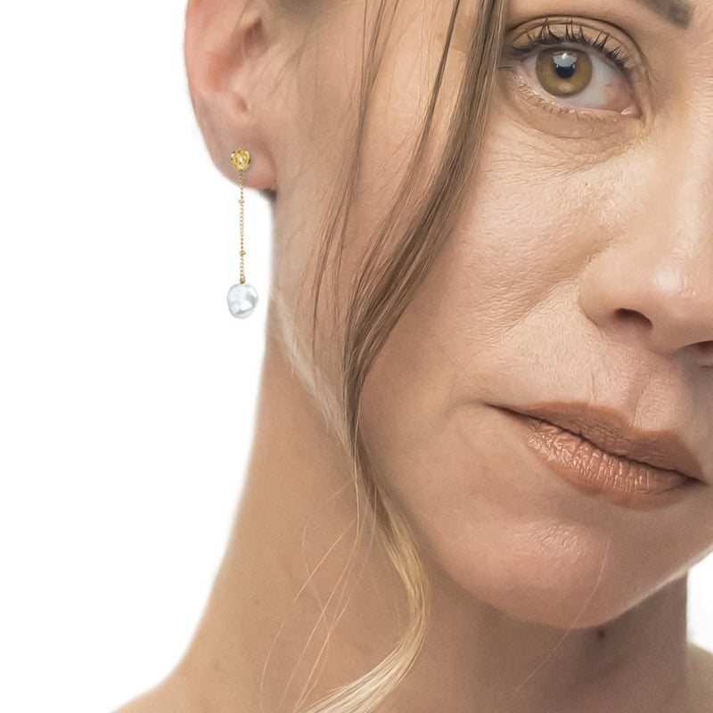 Mono orecchino in acciaio con orecchino a bottone martellato con pendente removibile composto da catena grumetta con sfere con perla bianca irregolare rivestita. Lunghezza totale 5,8 cm. Disponibile in acciaio e acciaio con pvd oro.