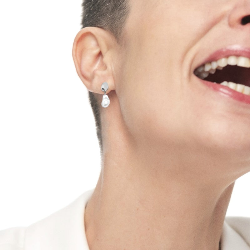 Mono orecchino in acciaio con orecchino a bottone martellato con perla bianca irregolare rivestita pendente. Lunghezza totale 3 cm. Disponibile in acciaio e acciaio con pvd oro.