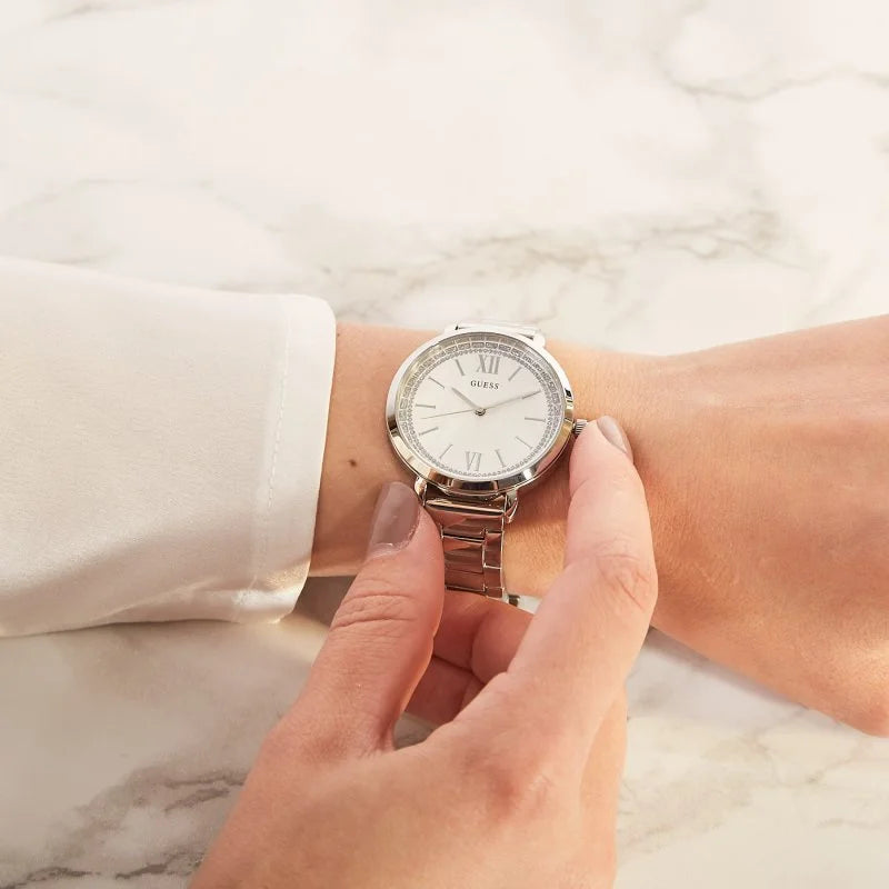 Orologio Solo Tempo Da Donna Di Guess. Orologio Con Cassa Del Diametro Di 38Mm In Acciaio Lucido, Quadrante Silver Con Dettagli Glitterati E Bracciale Acciaio Lucido. La Resistenza All'Acqua È 3 Atm. La Referenza È W1231L1