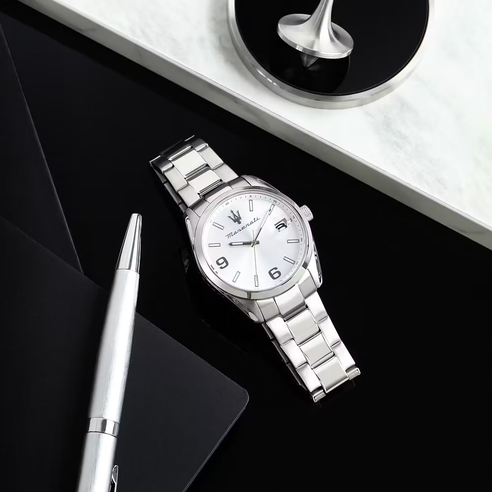 Orologio da uomo di Maserati della collezione Attrazione. Orologio tempo e data realizzato in acciaio con diametro cassa di 43mm. Orologio in vetro minerale con lente d'ingrandimento e resistenza all'acqua di 5 atm. Il cinturino è di colore acciaio.