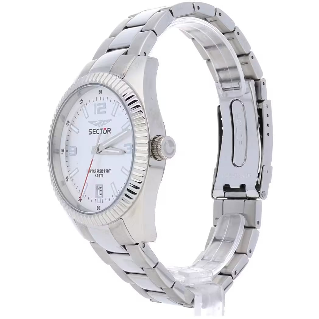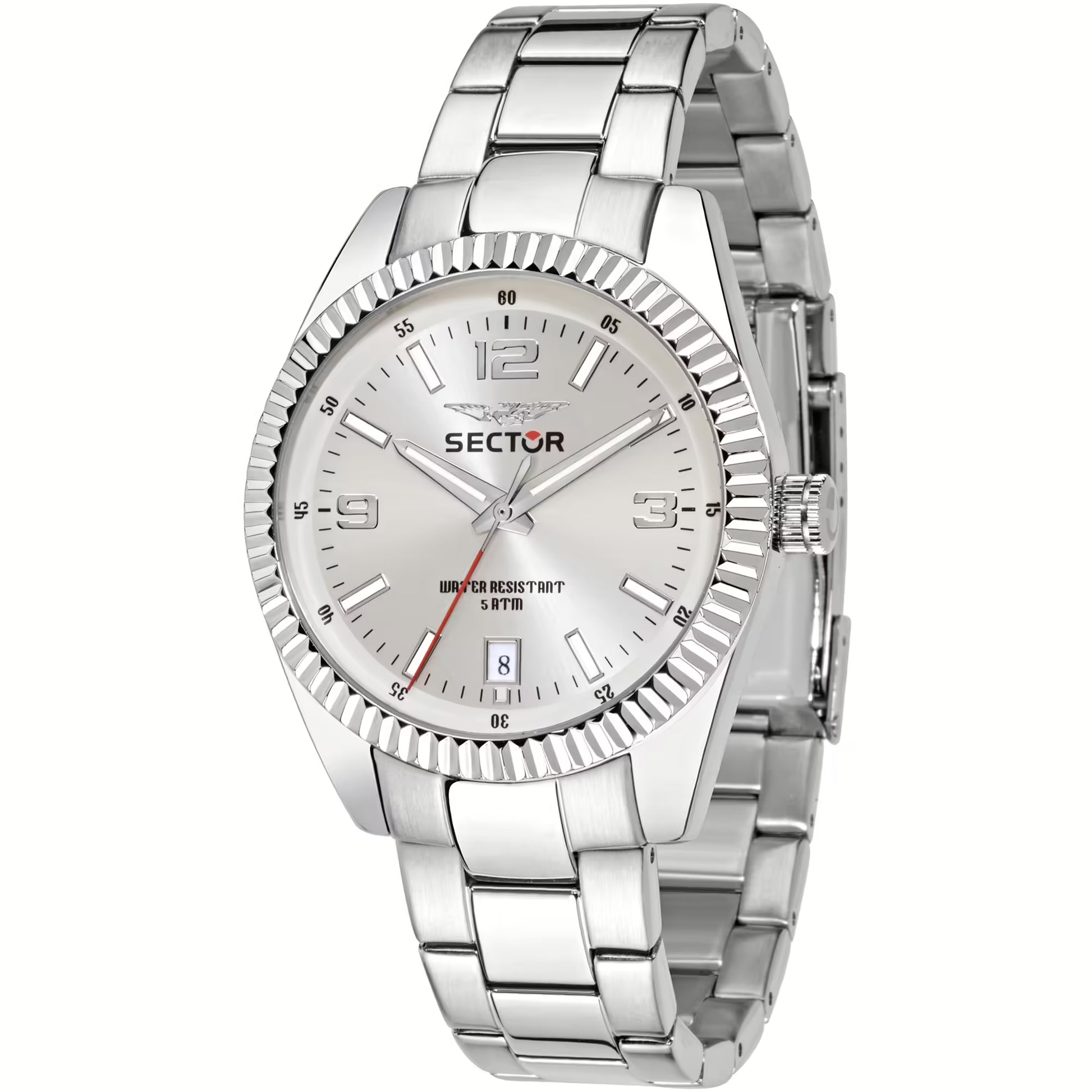Orologio Sector uomo. L'orologio è un solo tempo con tre lancette; l'orologio ha la cassa in acciaio di color acciaio. Il quadrante è di colore silver e la forma della cassa rotonda, il diametro della cassa è di mm 41. L'orologio ha un cinturino in acciaiodi color acciaio. Il movimento dell'orologio è: quarzo, l'orologio presenta il datario: si. La resistenza dell'orologio è di atm 5.