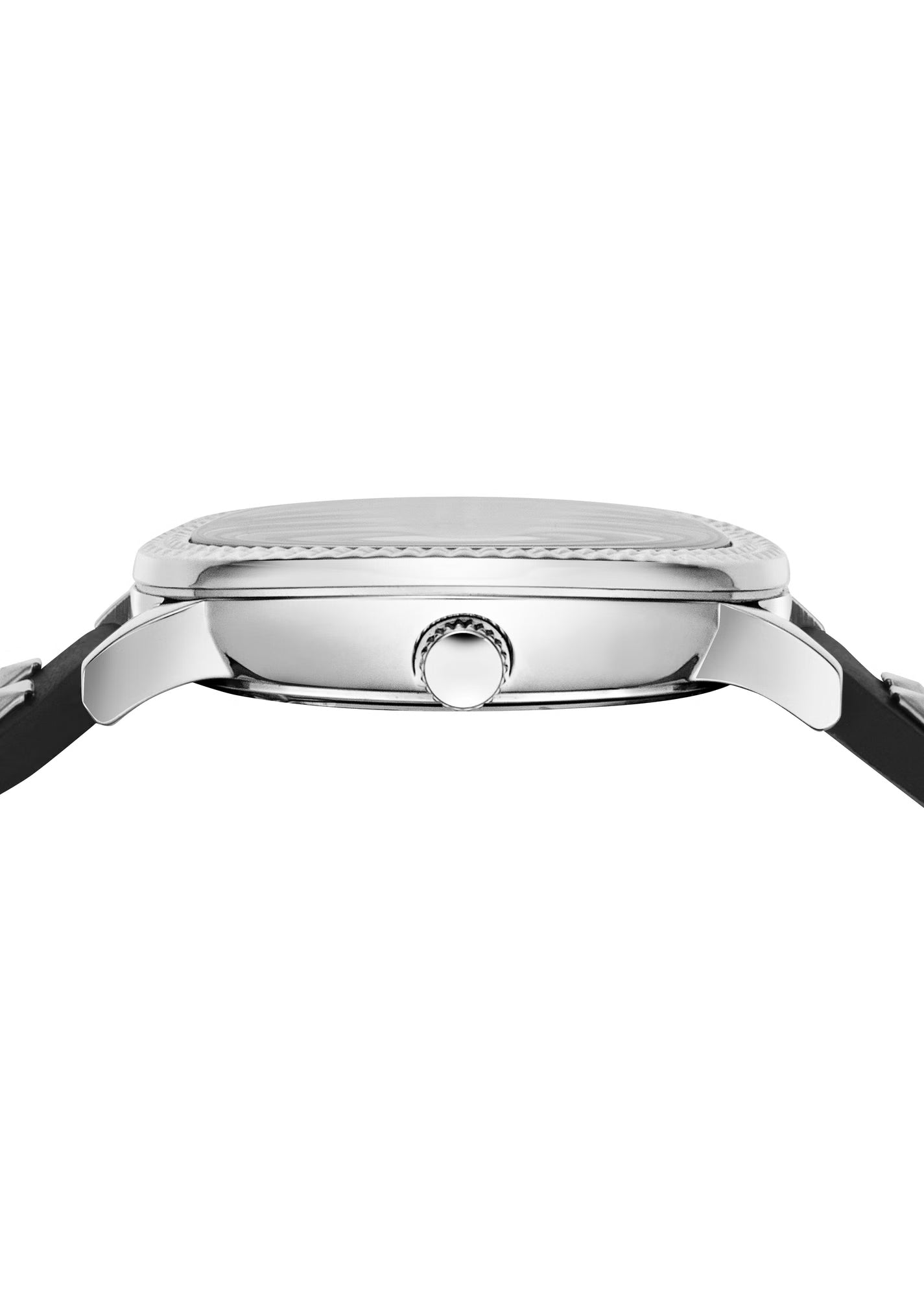 Lunetta Lavorata: La cassa in acciaio inossidabile argentato è incorniciata da una lunetta con texture a rilievo che richiama il motivo geometrico delle borchie, creando continuità nel design.